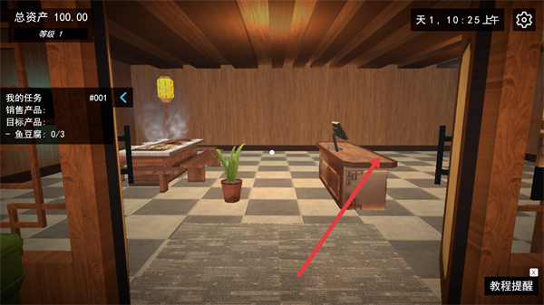 2、進入店鋪后,界面左側顯示任務001,目標是銷售3份魚豆腐,當前進度0,中間有點擊打開入門的提示,按指引點擊對應區域,可開啟入門教程了解經營操作。