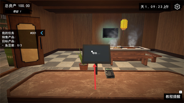 3、打開入門后進入店鋪內部,可見操作臺與收銀臺等設施,左側任務仍顯示銷售魚豆腐的目標,此時可先熟悉店鋪布局,后續通過操作設施來制作、售賣關東煮產品。