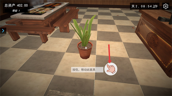 1、界面顯示店鋪內的家具操作提示,針對盆栽有按住,移動此家具的指引,總資產為402.00、等級1,按提示按住盆栽,即可進入家具移動的操作流程,調整店鋪布局。
