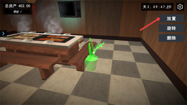 3、將盆栽拖動到目標區域后,點擊右側的【放置】按鈕,即可完成該家具的位置調整,此時盆栽會固定在新位置,通過合理擺放家具,能讓店鋪布局更合理、提升經營體驗。