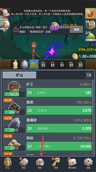 1、界面顯示礦山相關資源產出,含礦工、煤炭等項,底部有角色等功能按鈕,點擊角色按鈕可進入角色界面,同時礦山界面點擊煤炭圖片能提升其品質。