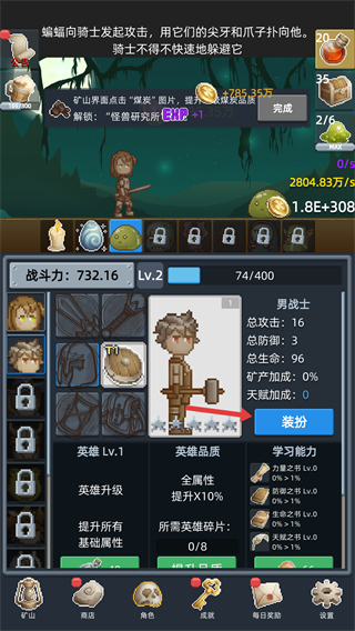 4、完成裝扮后,界面顯示裝扮中狀態,同時上方戰斗場景里角色形象會同步更新,此時可返回礦山界面繼續獲取資源,也能在角色界面進行英雄的升級、品質提升等操作。