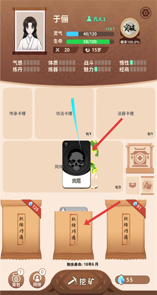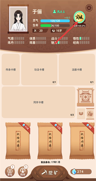 1、進入游戲后,查看角色的各項屬性,點擊挖礦按鈕獲取資源,同時可開啟機緣奇遇包裹,積累靈氣等成長所需的材料。