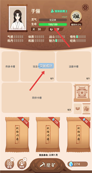 3、當角色的靈氣積累至滿值后,點擊突破按鈕,嘗試提升境界,突破過程有對應的成功率,需確保自身狀態符合條件。