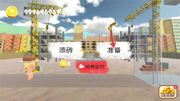 2、在操作界面中可選擇添磚功能消耗資源獲取磚塊,或點擊免費金幣按鈕補充資源,助力建筑進程。