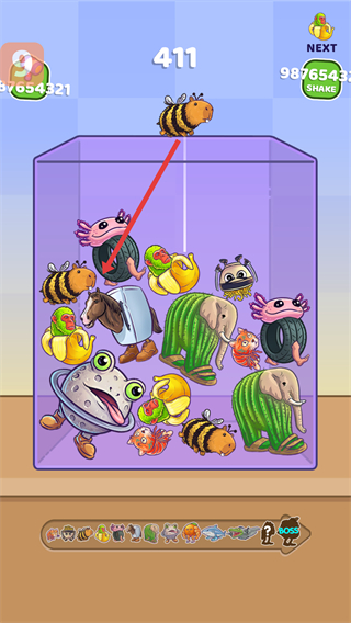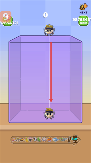 1、界面顯示初始游戲場景,頂部有角色,底部框內也有相同角色,按照指引的紅色箭頭方向,將頂部角色向下放置到框內,可觸發合成操作,這是積累物品的初始步驟。
