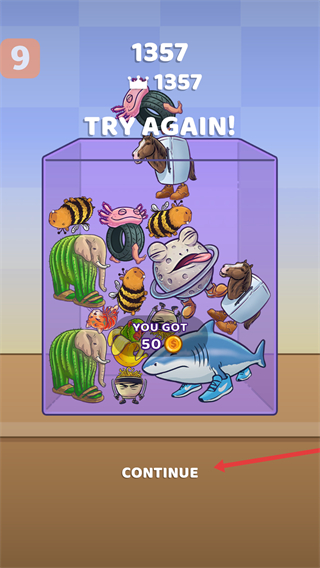 4、結束該局后,界面顯示【TRY AGAIN】提示與獲得的50金幣獎勵,點擊【CONTINUE】按鈕可進入下一局游戲,繼續通過放置、合成物品來積累分數與金幣。