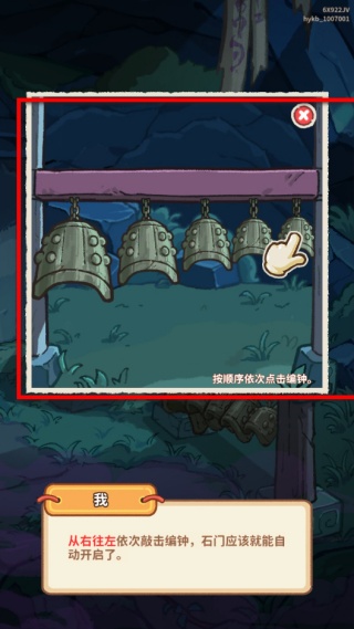 4、按照順序點擊編鐘,從右往左依次操作,完成后對應的石門會自動開啟,通過這一操作即可進入新的場景,繼續游戲進程。