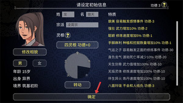 1、界面需設定初始信息,可設置姓名、宗門,靈根可點擊轉動切換,特質需消耗功德選擇,選好后點擊確定,即可完成初始信息配置進入游戲。