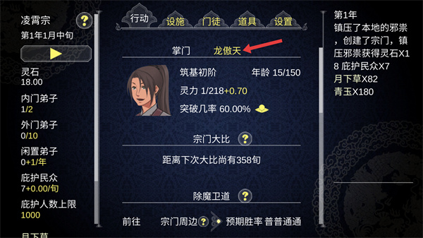 5、所有重大事件、弟子突破結果與資源交易均有據可查,方便玩家復盤經營策略。日志本身也成為閱讀門派編年史的趣味來源。