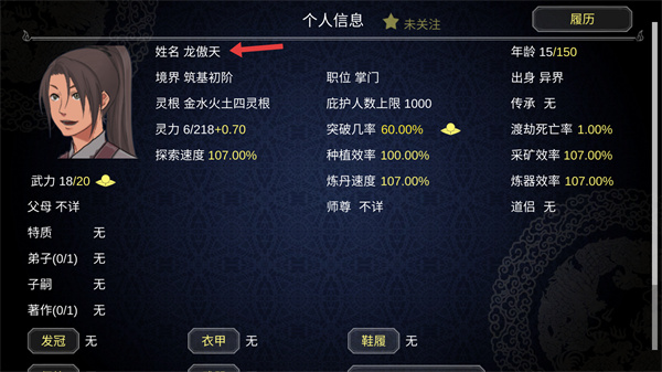 4、進入個人信息界面,可查看姓名、境界、靈根等詳細屬性,還有武力、突破幾率等數值,也能看到種植、采礦等效率,方便了解自身當前的能力狀態。