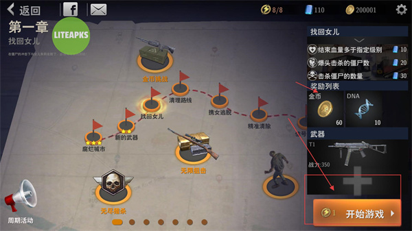 1、在章節界面選擇找回女兒關卡,消耗1點體力點擊開始游戲進入,完成關卡可獲得金幣、DNA及武器獎勵。