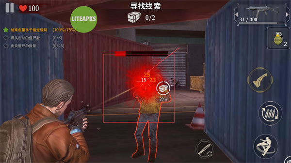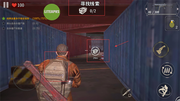 2、進入關卡后,目標是收集2個線索箱,先沿集裝箱通道移動,定位24米外的線索箱,同時留意僵尸刷新。