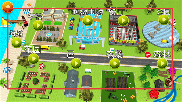3、進入后會看到包含海灘、學校、超級市場等場景的地圖,每個場景旁有啟動按鈕,點擊對應場景的按鈕,即可進入該場景體驗互動內容。