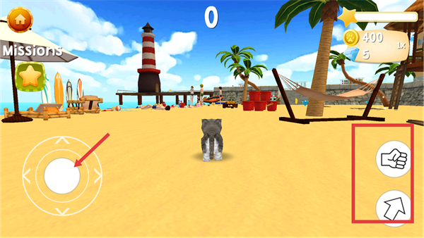 4、進入場景后左側虛擬搖桿可控制貓咪移動,右側有互動、跳躍按鈕,界面還顯示任務、金幣鉆石數量,操控搖桿移動貓咪即可進行探索。