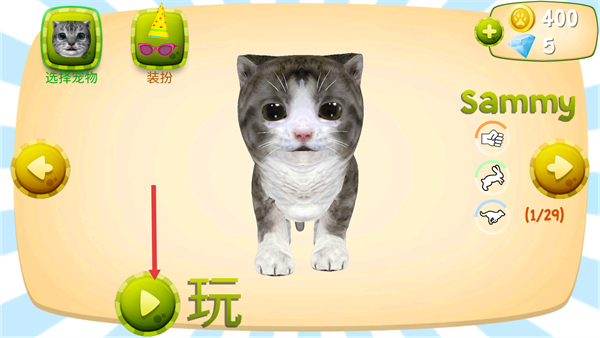 1、進入軟件界面后可選擇寵物、裝扮角色,確認后點擊下方的玩按鈕,即可進入游戲模式選擇環節,開啟貓咪模擬的游玩流程。