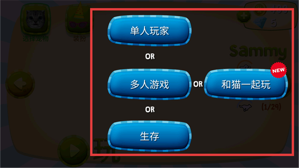 2、點擊玩后會出現玩法選項,包含單人玩家、多人游戲、和貓一起玩、生存模式,選擇對應選項即可進入相應模式。
