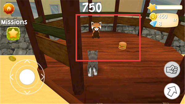 3、遇到其他動物角色與食物道具時,操控貓咪靠近目標,通過互動操作可觸發角色互動、獲取食物增益。