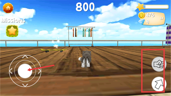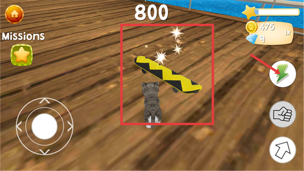 2、看到帶閃光的對象如滑板時,可操控貓咪靠近,再點擊右側閃電圖標激活加速技能,借助滑板能更快移動。