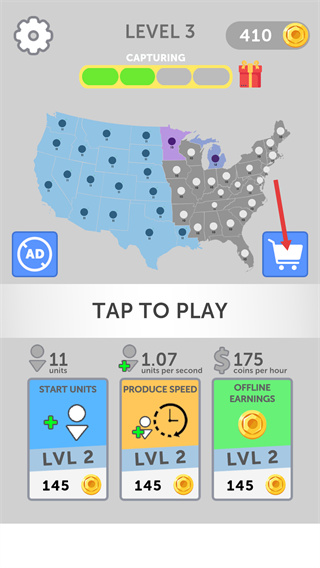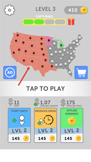 1、進入關卡界面后,可看到地圖上己方藍色區域已拓展,下方有屬性升級選項,可消耗金幣提升初始兵力、生產速度等屬性,點擊【TAP TO PLAY】即可開始該關卡的占領玩法。