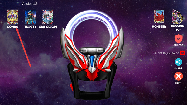 1、進入主界面后,可看到多個功能選項,點擊【COMBO】標簽,即可進入融合組合列表界面,查看可用于融合的奧特曼卡片,為后續融合操作做準備。