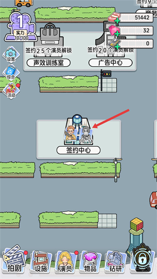 1、界面顯示實力進度為10,可看到聲效訓練室需簽約25個演員解鎖、廣告中心需簽約20個演員解鎖,同時能找到簽約中心入口,可在此進行演員簽約相關操作。
