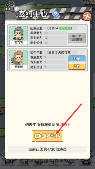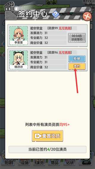 2、進入簽約中心后,會顯示待簽約演員信息,包含資質、發展潛力等屬性,若對當前演員資質不滿意,可點擊重置資質按鈕刷新列表,方便挑選優質演員。