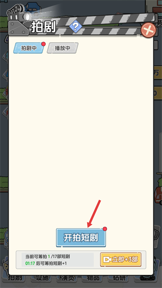 2、進入拍劇界面后,可看到拍劇中和播放中狀態,當前可籌拍1部短劇,點擊開拍短劇按鈕可進入短劇拍攝配置頁。