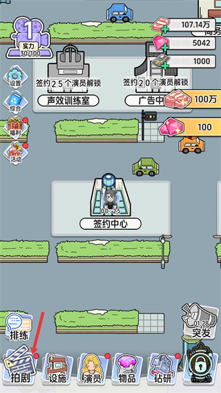 1、界面顯示實力進度30,聲效訓練室需簽約25個演員解鎖,同時底部有拍劇、設施等功能按鈕,點擊拍劇可進入拍劇界面。
