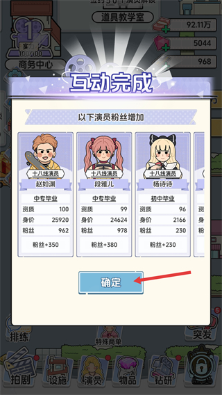 4、互動完成后會彈出結果頁面,展示參與演員的粉絲增加情況,包含演員的資質、身價等信息,確認信息后點擊確定按鈕,即可完成此次互動并返回相關界面。