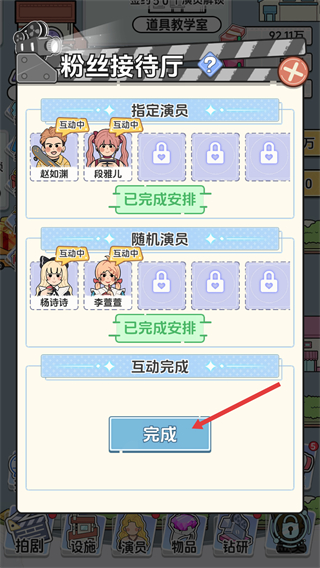 3、選好參與互動的演員后,指定演員和隨機演員板塊會顯示互動中狀態,全部安排完成后,點擊互動完成板塊下的完成按鈕,即可結束當前的粉絲互動流程。
