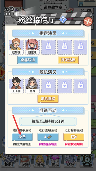 2、進入粉絲接待廳后,可選擇指定演員或隨機演員參與互動,準備互動環節有握手、簽名、合影三種方式,其中握手互動可免費參與,能少量增加演員的粉絲數量。