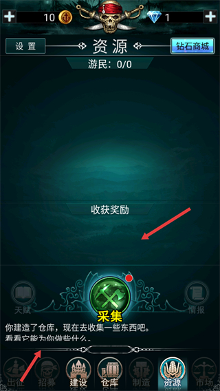 2、解鎖倉庫后點擊采集按鈕獲取物資,同時可通過底部功能欄的招募、建設等選項拓展荒島設施。