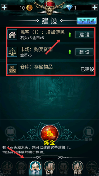 3、進入建設界面,消耗對應資源建設民宅、市場等建筑,提升荒島的資源產出與存儲能力。