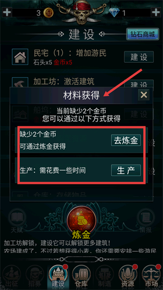 4、若材料不足,可通過去煉金或生產功能獲取,完成材料收集后繼續推進建筑建設。