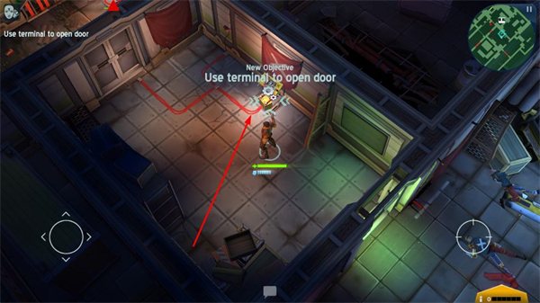 2、查看界面顯示的任務提示,操控角色移動到終端設備位置,以此解鎖對應的門,繼續推進關卡流程。