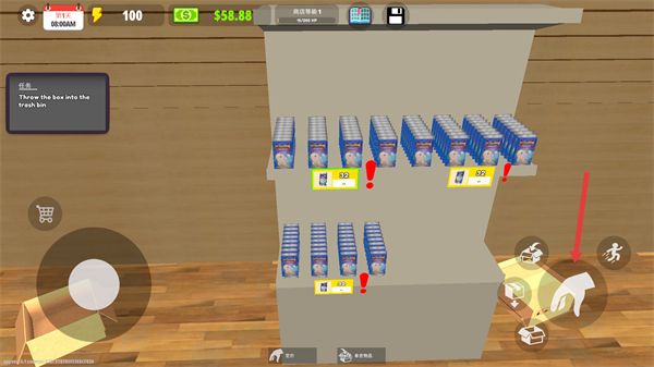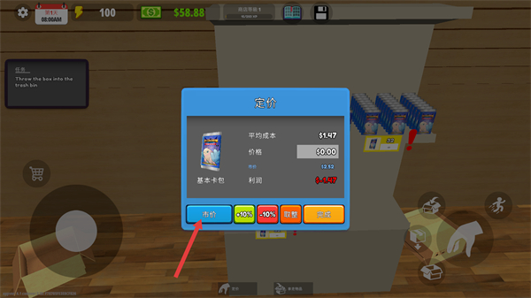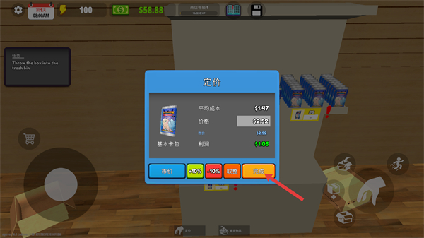 1、界面顯示當前資金、時間等信息,貨架上有帶提示標識的商品,點擊右側對應功能按鈕,可進入商品定價界面,后續可通過該界面調整商品價格,推進店鋪運營。