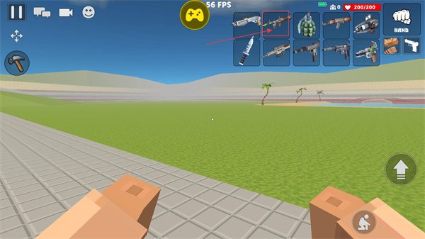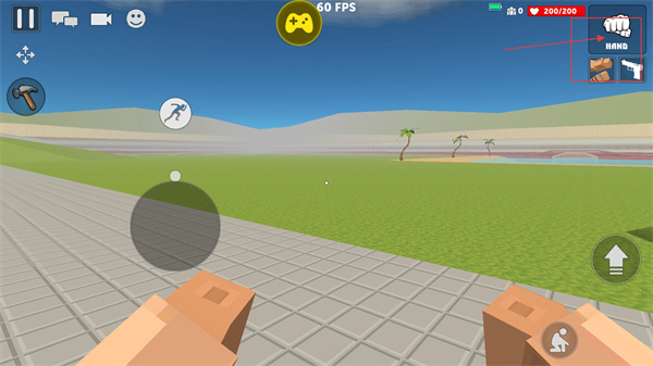 1、進入游戲界面右側是武器切換欄,當前選中手模式,左側有移動、互動按鈕,玩家可結合武器欄切換裝備火箭發射器。