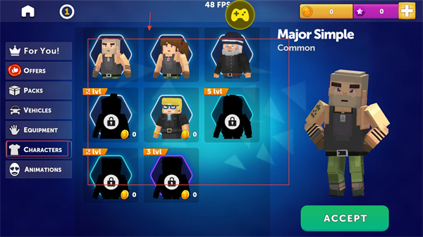 2、角色界面展示多個可選形象,部分角色需等級解鎖,點擊ACCEPT可確認使用當前角色,不同角色無屬性差異。