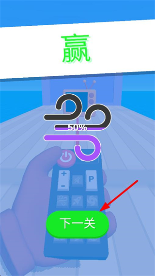 2、成功操作后會出現顯示贏的界面,進度條達到50時,界面會出現綠色的下一關按鈕,點擊它就能進入下一個關卡。