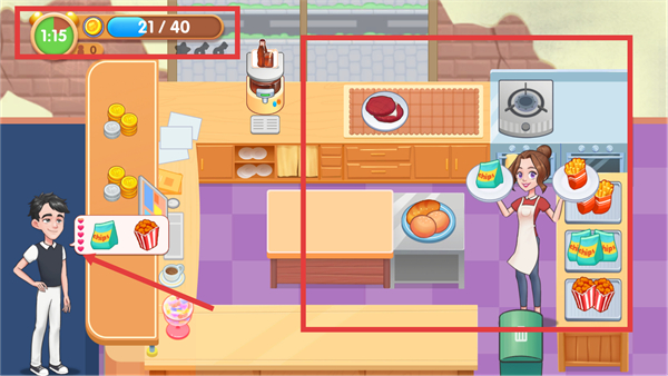 2、進入烹飪場景后,留意左側顧客的需求顯示,要快速從右側備餐區取對應食物,及時遞送給顧客,積累金幣的進度。
