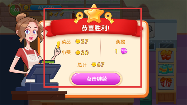 4、當達成關卡金幣目標后,會顯示恭喜勝利的結算界面,可查看菜品收益、小費等總計收益,點擊點擊繼續即可結束當前關卡。