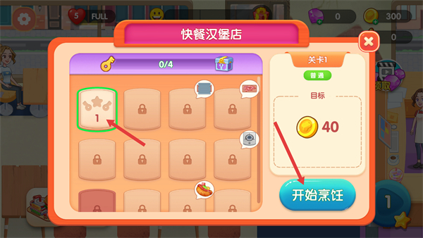 1、進入快餐漢堡店關卡界面后,先確認當前關卡的目標,接著點擊開始烹飪按鈕,即可進入該關卡的烹飪經營環節。