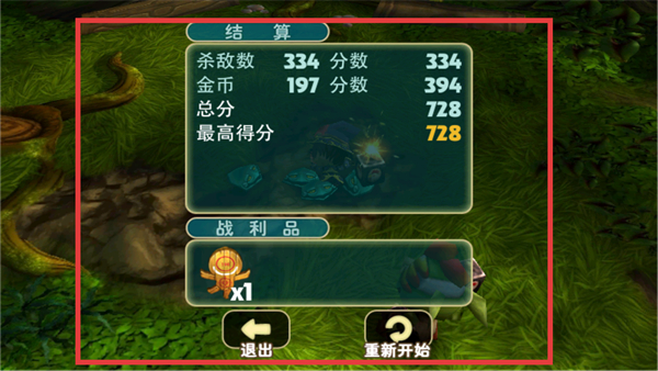 4、戰斗結束后會進入結算界面,可查看殺敵數、金幣、總分等數據,還能獲得戰利品獎勵,可點擊重新開始按鈕再次挑戰該關卡。