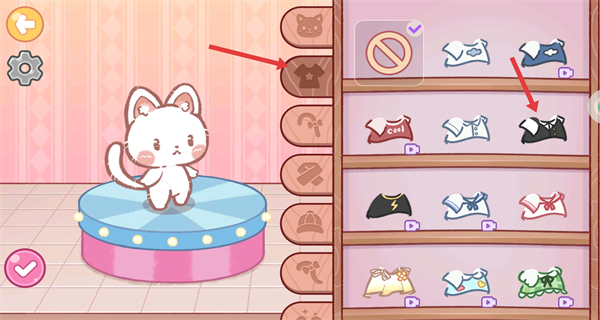 3、切換到左側分類欄里的服飾選項,從右側陳列的服飾中選擇合適的款式,點擊后即可為裝扮臺上的小貓更換該服飾。