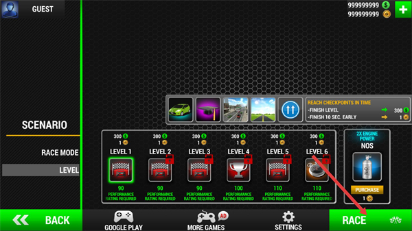 1、在關卡選擇界面,選定目標關卡后點擊RACE開始比賽,不同關卡有不同難度與獎勵,按需選擇推進游戲進度。
