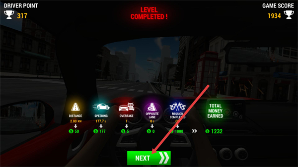 4、完成關卡后會顯示LEVELCOMPLETED,可查看獲得的DRIVERPOINT與GAMESCORE,點擊NEXT進入下一關。