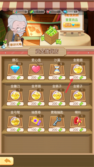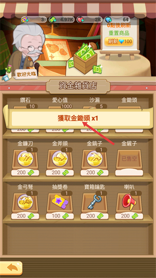 3、資金雜貨鋪中,陳列著多種物品,如鑽石、愛心值、金鋤頭等,每種物品對應不同的花費,找到【金鋤頭】選項,準備用對應資源兌換該道具。