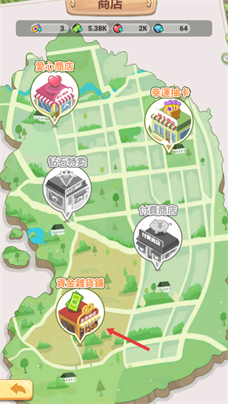 2、進入商店界面后,可看到多種商店類型,包括愛心商店、幸運抽卡等,選擇【資金雜貨鋪】,點擊對應的標識即可進入該雜貨鋪,查看可兌換的物品。
