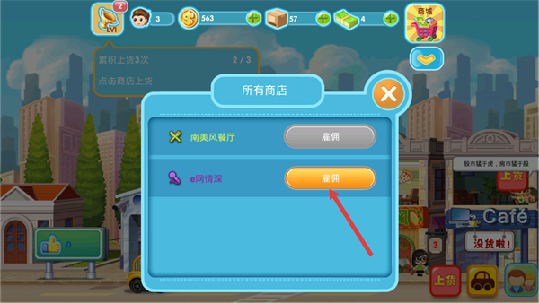 4、在彈出的所有店鋪列表里,找到顯示可點擊雇傭按鈕的店鋪,點擊該按鈕即可完成對應店鋪的雇傭操作,提升店鋪的運營能力。